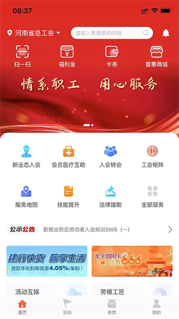 工会E卡app的推出标志着河南省工会服务迈入数字化新阶段。它通过技术创新实现了服务方式的革新、服务领域的拓展、服务质量的提升,为职工会员提供更加精准、高效的订单式服务。平台采用智能化设计,操作界面简洁明了,让不同年龄段的职工都能轻松上手,切实感受到"娘家人"的温暖关怀。