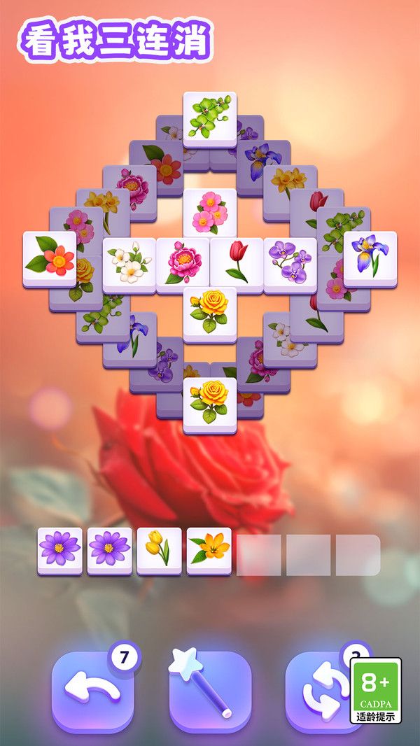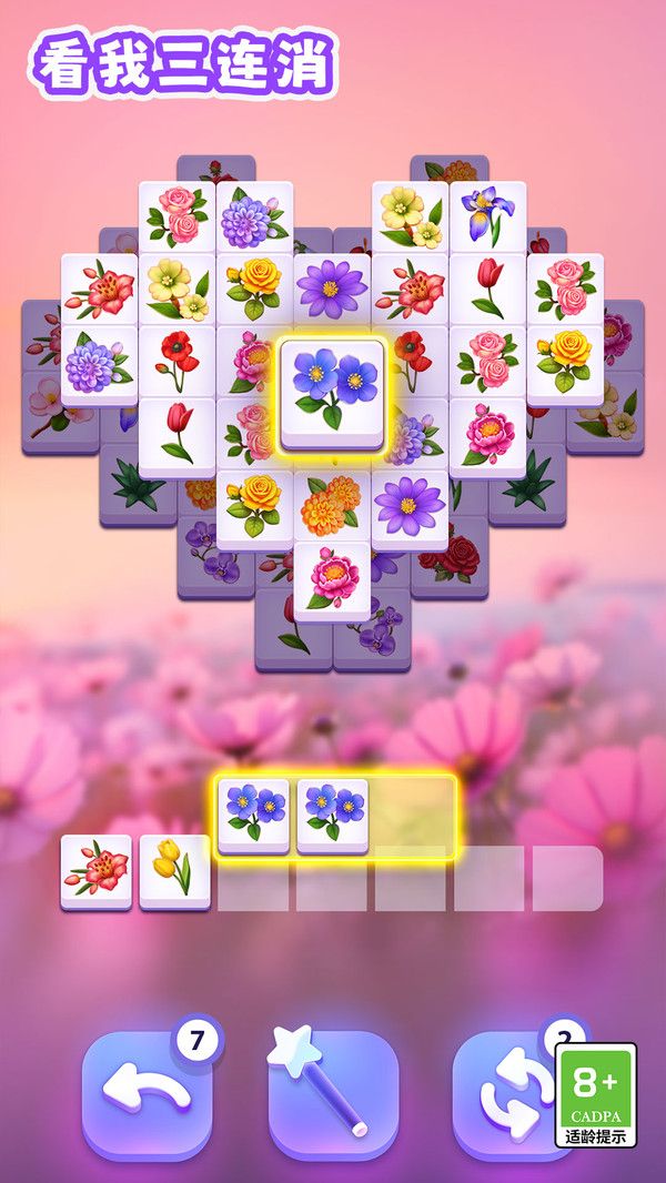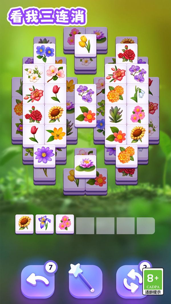 游戏的核心玩法是找出三个相同图案的花朵方块,将它们放置在有限的格子空间中进行消除。玩家可以跟随游戏进程,穿越各种美丽的风景,解锁全新的游戏场景,体验多样化的游戏内容。每个关卡都需要玩家提前规划好消除顺序,合理利用有限的格子空间,争取在最短的步数内完成目标。游戏还设置了多种特殊道具和加成效果,玩家可以通过巧妙使用这些道具来解决棘手的关卡难题。