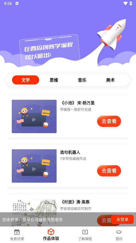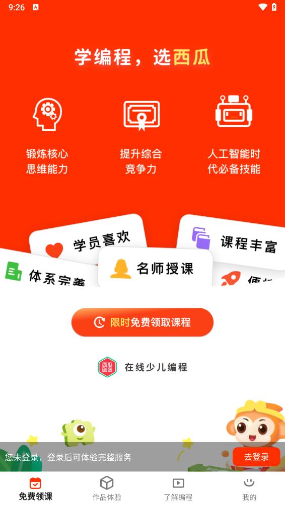 欢迎下载西瓜创客体验版app,这是一款专为7-12岁儿童打造的编程启蒙教育服务平台。通过丰富完善的课程体系,西瓜创客致力于培养孩子的编程思维与创造力,帮助他们在轻松有趣的氛围中掌握未来必备技能。作为课程内容和作品的提前体验平台,西瓜创客体验版让家长和孩子能够先睹为快,感受编程学习的魅力。