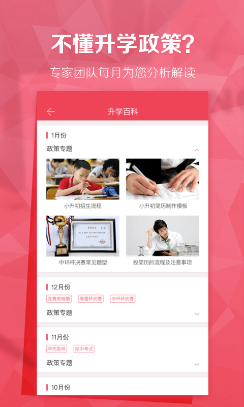 当孩子处于关键的升学阶段时,家长可以在APP中一站式获取孩子所需的所有学习资源,包括模拟试卷、升学资讯、最新政策解读等,再也不用为信息分散而烦恼。