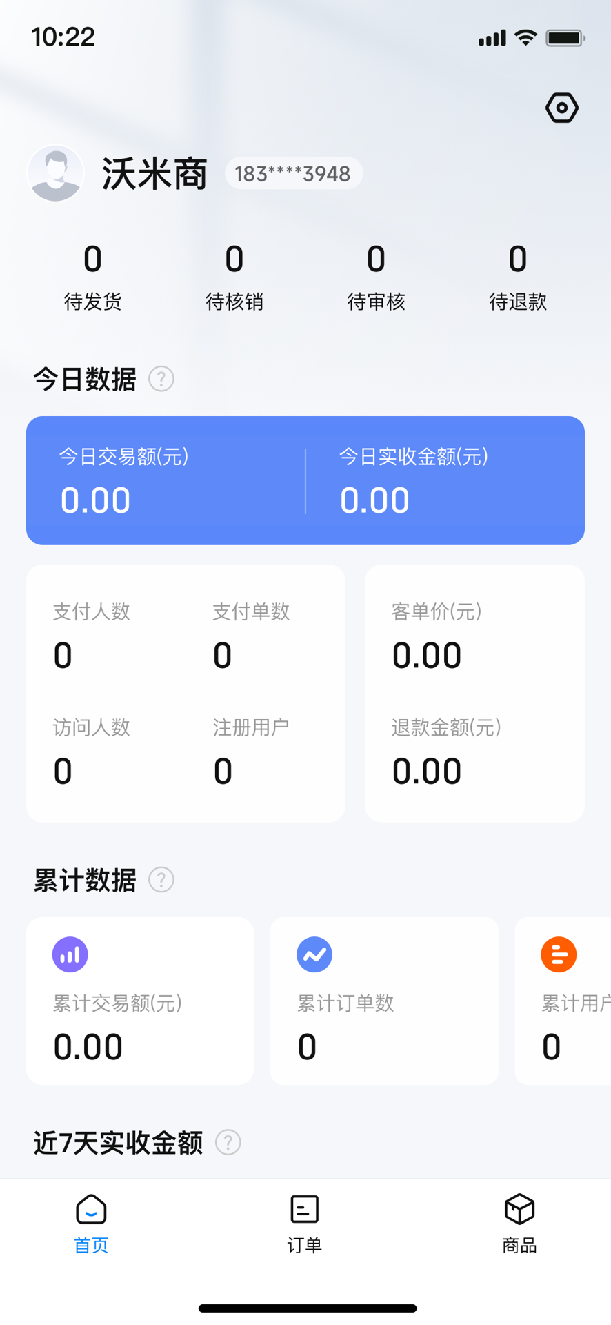 在商品管理方面,沃米商商城助手支持商品的新增、编辑、上下架以及库存调整等操作,并允许不同店铺上架不同的商品,满足多店铺管理的需求。首页模块则直观展示了用户的登录信息、待办事项以及店铺的实时经营数据,包括当日销售汇总和近7天的实收金额与用户注册量折线图,帮助商家快速掌握运营动态。