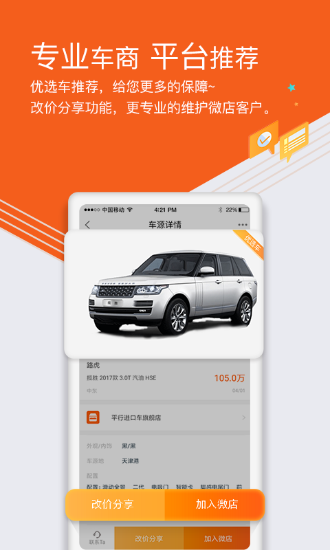B2B端:在线车辆选购、车源寻车发布、在线供应链申请、车辆采销管理、定金担保、整车业务支持库