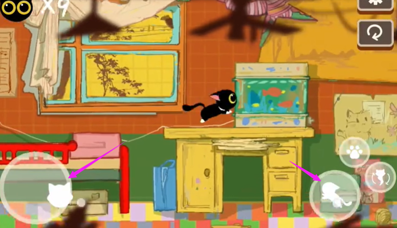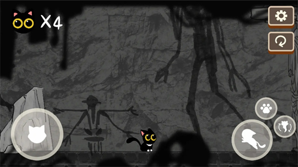 进入游戏后界面左边小猫移动右边控制小猫跳跃交互还有技能。操作界面简洁直观,左侧虚拟摇杆控制移动,右侧按钮分别对应跳跃、互动和特殊技能,玩家可以自定义按键位置以适应不同操作习惯。