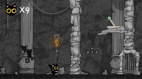 上方的猫猫代表了小猫的生命,猫有九命死而复生,如果玩家把九条命用完就会游戏失败。生命值以猫爪图标直观显示,每次失败后会在最近检查点复活,玩家需要合理规划路线减少生命消耗。