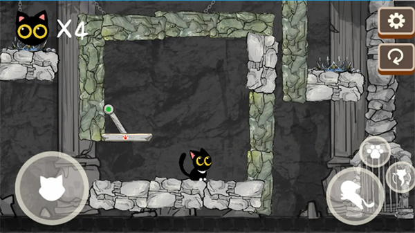 进入关卡后控制小猫前往拉杆处,右边的按钮,即可控制石柱或者是机关转动。游戏中的机关设计巧妙,有些需要特定顺序激活,有些则考验玩家的时机把握能力。