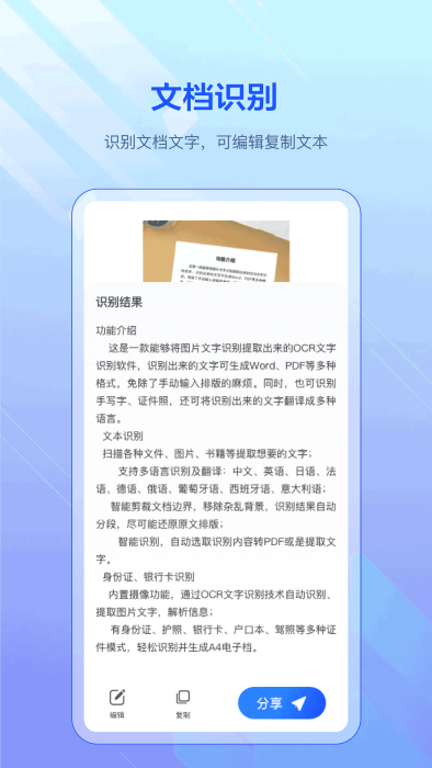 精准识别文档中的文字内容,支持编辑和复制文本,方便用户快速提取和修改所需信息,提升工作效率。