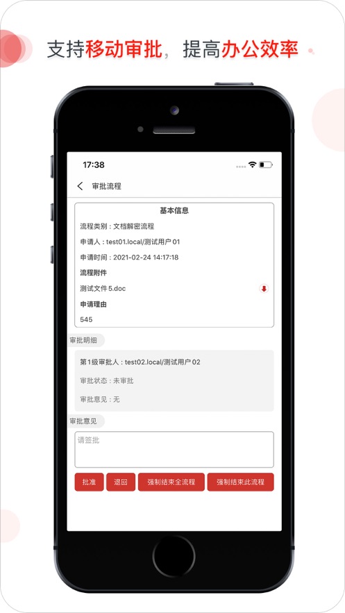 提供完整的移动审批解决方案,支持手机端线上审批操作,审批消息实时推送提醒,确保业务流程不延误。系统支持流程附件查看和会签审批功能,满足复杂审批场景需求。同时具备文件包解压功能,方便用户处理压缩格式的审批材料,大大提升审批效率。