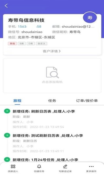 客户管理模块:创新性地采用一键扫描录入功能,简化新客户信息采集流程;通过集中化的客户资源管理,有效防止客户流失;智能设定客户跟进规则和公开权限,确保每个客户都能得到及时、专业的持续跟进服务。