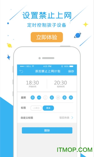 禁止上网计划:支持自定义设置孩子手机的上网时段和时长,超过预定时间系统将自动锁定屏幕,帮助孩子养成良好的作息习惯。