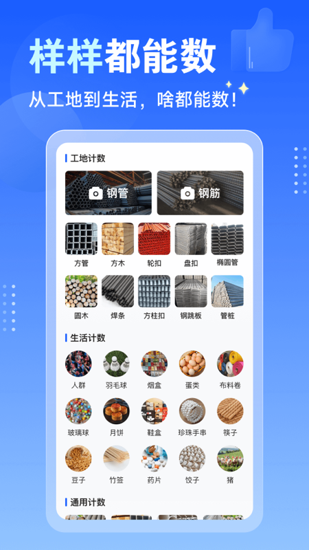 闪电数钢管APP是一款功能强大的智能计数软件,专为解决各类物品清点难题而设计。这款APP不仅能高效清点钢管数量,还能广泛应用于日常生活和工作场景,支持在线统计饺子、羽毛球、人群、鸡蛋、布料卷等多种物品。无论您是建筑工人、仓库管理员还是家庭主妇,都能通过这款APP轻松完成计数任务。所有计数记录都会自动保存,方便您随时查阅历史数据,大幅提升工作效率。操作简单直观,识别速度快,是您日常计数的得力助手。