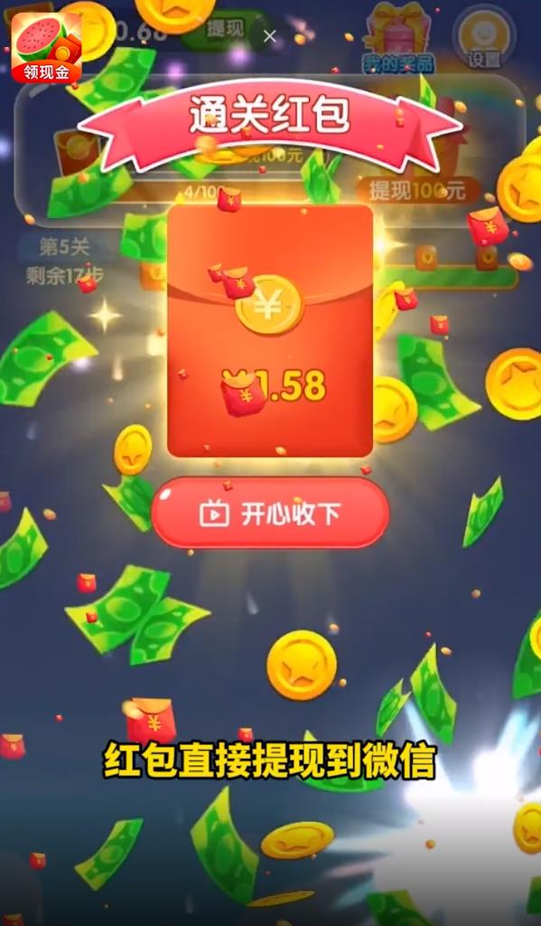 开心西瓜消消乐红包版最大的特色就是其独特的红包奖励系统。玩家只需下载APP,通过玩游戏、观看广告等方式就能轻松获得红包奖励。游戏内广告观看收益丰厚,每个广告都能带来0.3-0.5元不等的收入,满0.3元即可立即提现,资金秒到账。此外,游戏还设置了多种奖励机制,包括每日签到奖励、通关奖励、成就奖励等,让玩家在享受游戏乐趣的同时获得多重收益。游戏操作简单易上手,但想要获得高分和更多奖励,也需要玩家开动脑筋,运用策略。