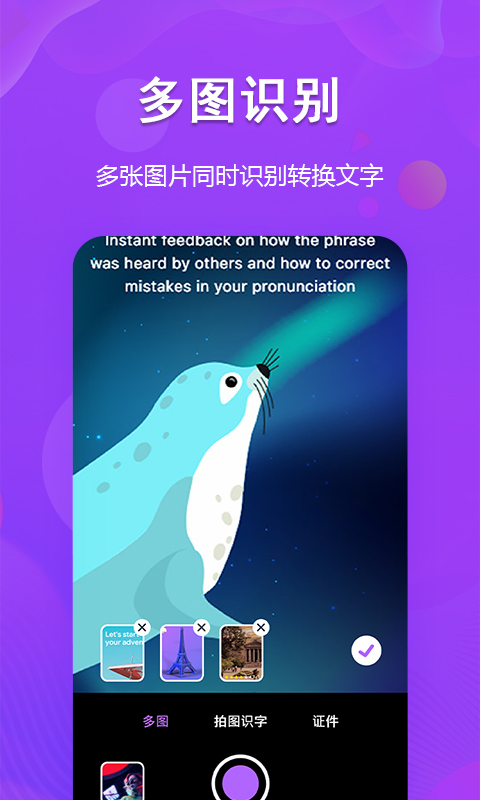 拍图识字:采用先进的OCR文字识别技术,支持单张或连续拍照识别,可批量处理多张图片。无论是印刷体书籍、文件资料,还是屏幕截图,都能快速准确地转换为可编辑文字。识别速度快,准确率高,大大提升工作效率。