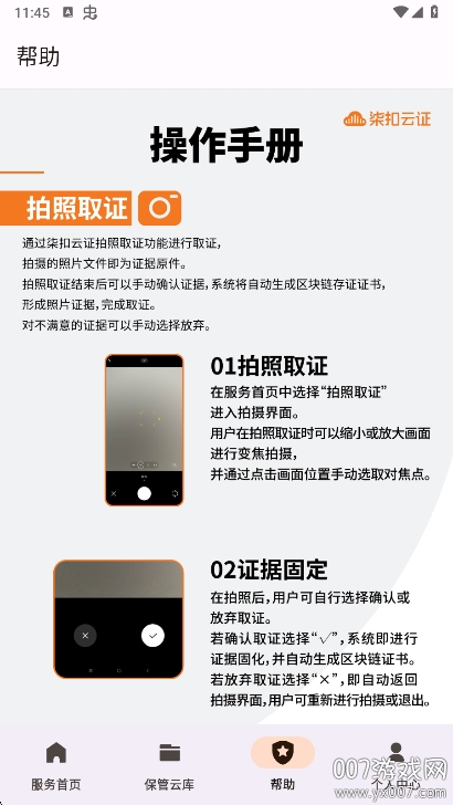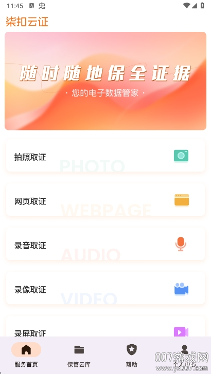 使用柒扣云证app非常简单,首先需要下载并安装应用程序,然后进行账号注册和登录。登录成功后,用户将进入功能丰富的首页界面,这里展示了各种取证功能模块。在底部菜单中,"保管云库"功能可以让用户查看和管理所有已保存的证据文件。如果用户在使用过程中遇到任何问题,可以点击帮助中心快速了解操作方法。对于每个取证功能,都有详细的说明和使用指南,用户只需选择需要的方法即可查看具体操作步骤,轻松完成取证工作。
