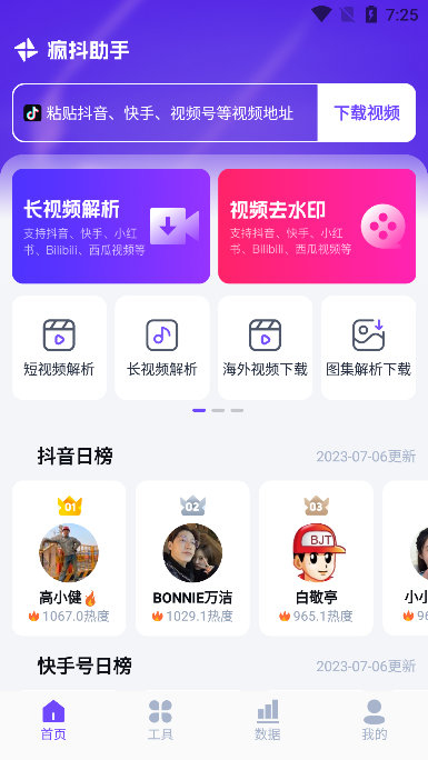 疯抖助手APP是一款功能强大的短视频分析与运营工具,专为短视频创作者和运营者打造。这款APP集成了多种实用功能,包括短视频下载、长视频解析、视频去水印、海外视频下载以及图集解析下载等,能够满足用户在不同场景下的需求。无论是个人用户还是专业团队,都能通过疯抖助手APP轻松获取高质量的无水印视频内容。此外,APP还提供了丰富的短视频运营工具,用户可以查看全网短视频平台的日榜、月榜、年榜等数据,全面掌握行业动态。达人信息一目了然,帮助用户更高效地运营短视频账号,提升内容创作和推广效果。疯抖助手APP操作简单,功能全面,是短视频运营的得力助手,快来下载体验吧!