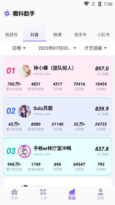 疯抖助手APP在实际使用中表现优异,获得了用户的高度评价。首先,APP提供了全面的短视频平台运营工具,包括数据分析、榜单查询等功能,所有信息清晰呈现,帮助用户快速掌握行业动态。其次,APP支持查看全平台博主资料,用户可以根据日榜、月榜等条件筛选达人,精准定位目标内容。此外,疯抖助手还能分析视频博主的运营内容、涨粉速度、粉丝画像等关键信息,为用户提供深度洞察,助力账号运营与内容优化。无论是新手还是资深运营者,疯抖助手都能为其提供强大的支持,是一款不可多得的短视频运营神器。
