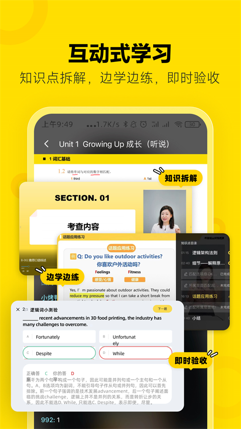 优化了口语评分的算法准确性,修复了部分机型播放卡顿的问题。新增写作批改的详细评分维度,强化了错题本的知识点关联功能。同时改进了直播课的画质和流畅度,提升了用户学习体验。
