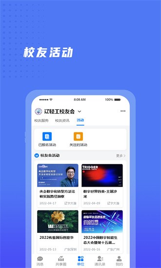辽宁轻工校友会免费下载平台为学校师生及校友搭建了一个高效便捷的沟通桥梁。通过该平台,用户可以轻松获取校园最新动态,参与各类合作项目,实现信息即时共享。软件整合了丰富的学习资源和实用功能,学生可免费下载学习资料,分享校园新闻。其创新的实时聊天系统和活动展示模块尤为突出,不仅拉近了校友与母校的距离,更为用户提供了拓展社交圈的机会,让校园生活更加丰富多彩。