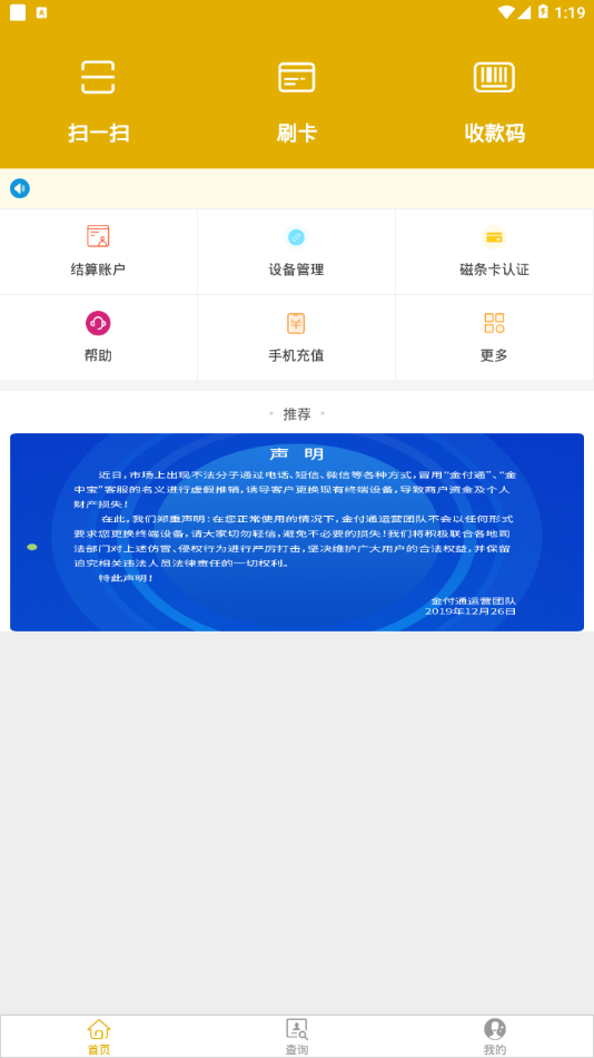 【金付通】是一款专为满足小微商户和个人用户收款需求而精心打造的移动支付应用程序。该软件采用先进的支付技术,结合智能硬件设备,为用户提供安全、稳定、高效的支付体验。通过蓝牙技术连接MPOS设备与金付通客户端,实现智能手机与支付终端的无缝对接。其外观设计小巧便携,操作界面简洁直观,即使是初次使用的用户也能快速上手。金付通不仅提供基础的收款功能,还整合了多种增值服务,致力于为用户打造全方位的移动支付生态圈。