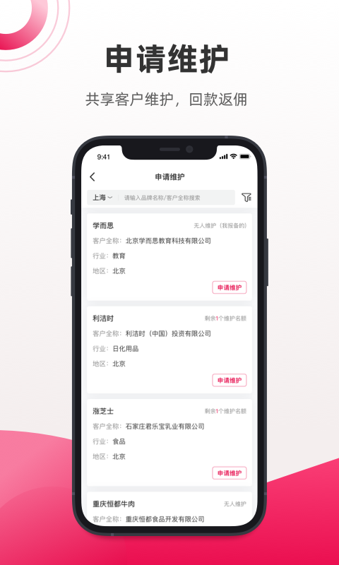申请维护:通过申请客户维护权限,您可以对客户信息进行补充完善,系统将根据维护贡献度计算返佣比例。该功能支持多人协作维护,确保客户信息实时更新。