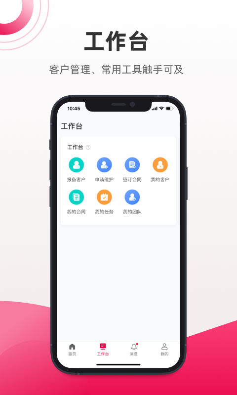 工作台作为核心操作区域,提供了完善的功能矩阵:报备客户功能可快速完成客户信息登记;申请维护功能支持客户信息完善与更新;签订合同功能实现线上合同签署全流程;我的客户模块集中管理所有客户资源;我的合同模块记录所有签约信息;我的任务模块跟踪待办事项;我的团队模块实现团队协作管理。