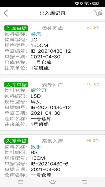 在这里,用户能够看到各个出入库单据内容,了解详细出入库情况;系统提供单据历史查询功能,可按时间、仓库、物料等多维度筛选查看。
