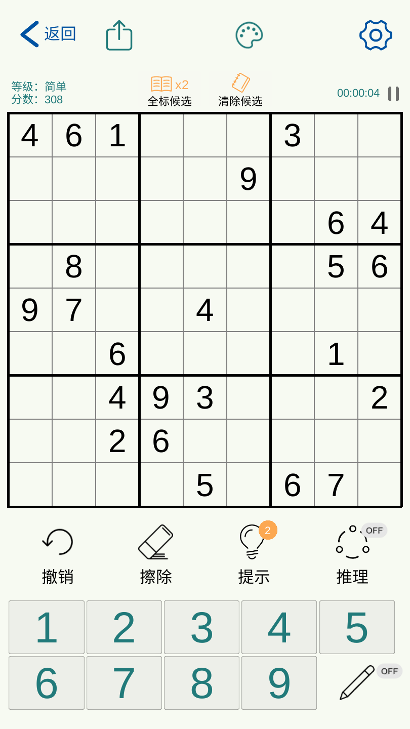 游戏全面考验玩家的观察能力和推理能力,需要玩家在9×9的方格中,根据已知数字的分布情况,运用数独规则进行逻辑推导。玩家必须确保填入的数字在每一行、每一列以及每一个3×3的小宫格内都不重复出现。游戏特别设置了四宫格、六宫格和标准九宫格三种难度模式,新手可以从简单的四宫格开始练习,熟练后再挑战更高难度的模式,循序渐进地提升解题技巧。
