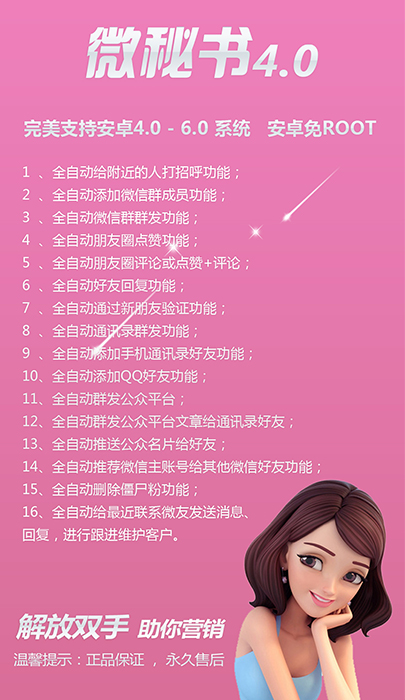 全自动微信群群发功能可以帮助用户一次性向多个微信群发送消息,大大提升信息传播效率。全自动朋友圈点赞功能可以智能识别好友动态并自动点赞,维护社交关系。全自动朋友圈评论或点赞+评论功能让互动更加个性化,增强好友粘性。全自动好友回复功能可以设置关键词自动回复,不错过任何重要消息。全自动通讯录群发功能支持批量发送节日祝福或营销信息。全自动添加手机通讯录好友功能能快速拓展人脉资源。全自动群发公众平台功能适合自媒体运营者使用。全自动删除僵尸粉功能可以定期清理无效好友,保持通讯录质量。