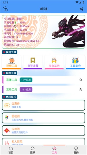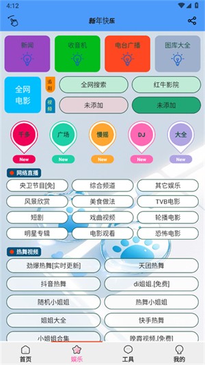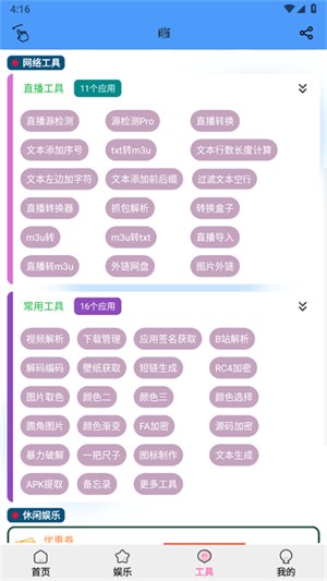 在本站下载安装萌兔工具后,打开软件即可看到清晰分类的首页界面。首页展示了丰富的电视频道资源,用户可以根据个人喜好自由选择观看。进入娱乐板块后,您会发现这里集成了网络直播、电台广播、图库大全等多种娱乐功能,满足不同用户的休闲需求。工具页面则提供了更多实用工具,包括视频解析、资源提取等,每个工具都有详细的使用说明,让您轻松掌握各项功能的使用方法。