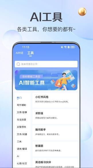 【AI写作】AI智能写作:通过输入文章需求,AI能智能改写并一键创作,快速生成高质量文本,解放用户双手。无论是新闻报道、产品描述还是故事创作,AI都能根据用户需求生成符合要求的文本内容,让写作变得更加轻松。AI伪原创:只需输入原文或粘贴文案,AI可以一键生成伪原创内容,确保文本的独特性与新鲜感。这一功能特别适合需要频繁发布内容的用户,帮助他们在保持原创性的同时提高效率。【AI对话】智能对话功能,无论是解答问题、寻找信息,还是日常闲聊,它都能提供准确、流畅的交流体验。AI能够理解用户的意图,并提供有针对性的回答,让沟通更加高效。【多种工具】关键词提取:全网热词挖掘,尤其适合抖音、小红书等平台,让内容紧跟流行趋势,抓住流量机会。用户可以通过这一功能快速了解当前热门话题,优化自己的内容策略。繁简体转换:一键实时转换全文内容,无论是繁体字还是简体字,确保文章在不同场合的准确呈现。摘要生成:当内容太长时,AI帮忙筛选出核心信息,一键生成精简摘要,快速把握文章精髓。这一功能特别适合需要快速阅读大量文本的用户,帮助他们节省时间。