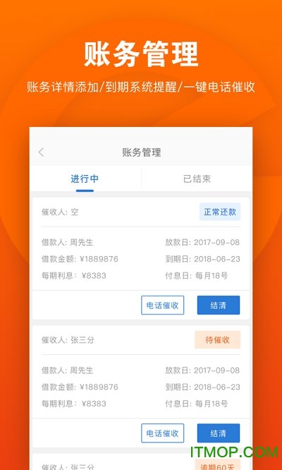 【账务管理】完善的账务管理系统,支持账务详情记录、到期自动提醒、一键电话催收等功能,提升财务管理效率。