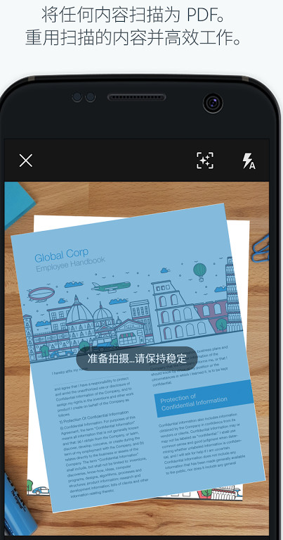 将你的文件转变为PDF格式。软件采用智能边缘检测技术,可自动识别各类文档边界,包括曲面拍摄的名片和褶皱的收据。支持多种文档类型预设模式,一键优化扫描参数。
