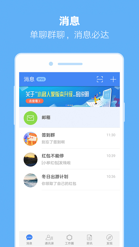 消息:提供群聊管理、消息回执、文件传输等进阶功能,支持消息云端同步和跨设备查看。