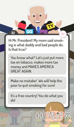 总统竞选模拟官方最新版是一款极具创意和沉浸感的政治模拟游戏,它以生动有趣的方式还原了美国总统竞选的全过程。在这款游戏中,玩家将亲身体验从初选到最终大选的每一个关键环节,包括发表演讲、应对媒体提问、与选民互动等。游戏特别设计了真实的民众反馈系统,每当玩家回答民众提问后,系统会实时显示支持率和反对率的变化,让你清晰掌握自己的竞选态势。