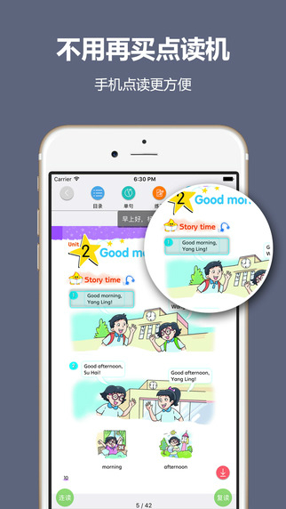 手机变身点读机:专为英语学习设计的点读功能,支持小学英语课本的在线和离线点读,即点即读配合中文翻译功能,是孩子课外英语复习的绝佳工具,为教师、家长和学生带来更多实用价值。
