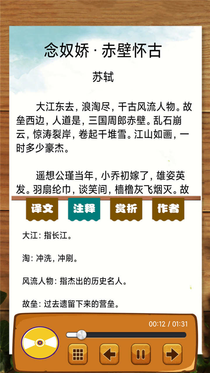 宋词三百首有声版App是一款专为学习宋词而设计的智能学习软件,它不仅能让用户通过文字阅读宋词,还能通过专业配音演员的朗读来感受宋词的韵律之美。这款App特别适合小朋友们学习宋词,帮助他们更好地理解词中的意境和情感。通过详细的注释、译文和赏析,孩子们可以轻松掌握每首宋词的背景和内涵,让学习变得更加生动有趣。