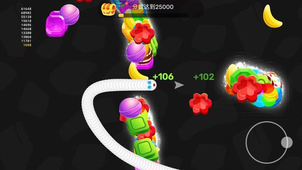 通过直观的摇杆控制系统,轻松操控小蛇在地图上灵活移动,吞噬各种造型的食物来增长身体长度。游戏加入了创新的加速功能,合理使用可以快速突袭对手,但要注意加速会消耗身体长度,需要谨慎把握时机。巧妙利用蛇身阻挡对手行进路线,迫使对方撞上你的身体而消失,从而获得更多食物快速成长。
