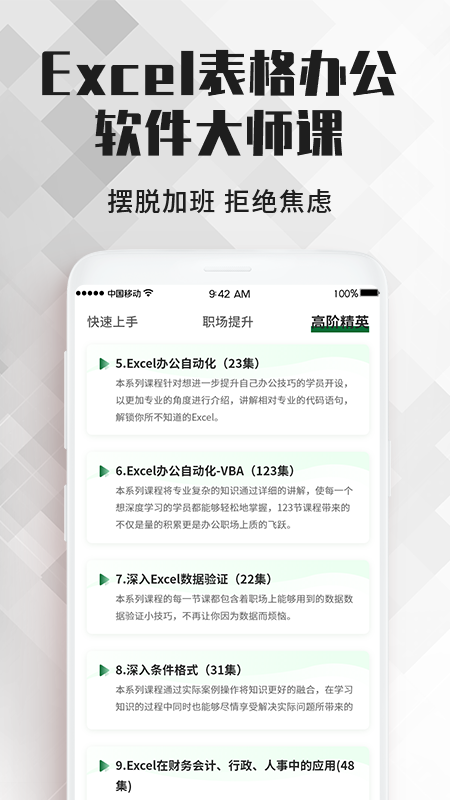 【效率十倍提升】精选200+职场实用技巧,如批量数据处理、智能填充、快速分析等高效操作方法。用户可根据自身工作需求选择对应课程,学完即可应用到实际工作中,显著提升日常办公效率。