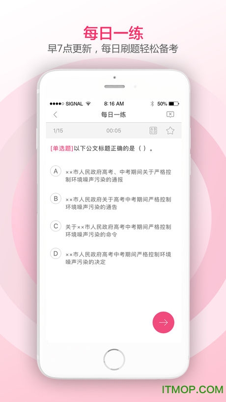 每早更新15题,备考练习轻松搞定。系统根据你的学习进度智能推送题目,涵盖各科目重点难点。完成练习后自动生成成绩分析报告,直观展示知识掌握情况。连续打卡还能获得积分奖励,兑换精品课程。