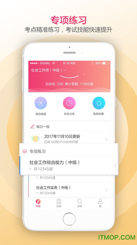 5大考试全知识点专项练习,不放过一个你可能不会的知识点。题库覆盖社会工作法规与政策、社会工作实务、社会工作综合能力等全部考试科目,每个知识点都配有详细解析和拓展阅读。专项练习、错题修改、做题历史、模拟试卷,为您全方位的练习方式,为成为社会工作者考生做好充分的准备。智能组卷功能可根据你的答题情况自动生成针对性练习,大幅提升复习效率。