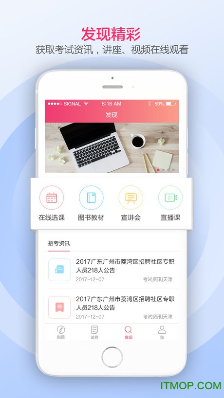 获取考试资讯,讲座、视频在线观看。APP内设考试动态专栏,第一时间更新各地报名时间、考试政策变化等信息。名师讲堂板块提供免费公开课,让你提前感受中公教育的教学品质。还有备考经验分享社区,与全国考生交流学习心得。