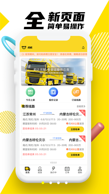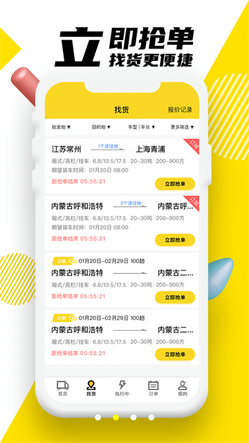 【立即抢单】找货更便捷。系统会根据您的位置和车型智能推荐附近货源,支持语音搜索和地图定位,让您随时随地都能找到合适的运输订单。