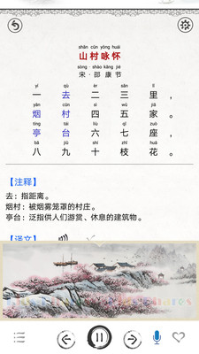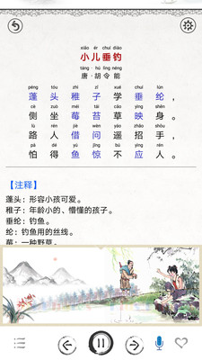 软件中的每一首唐诗都配有"白云出岫"老师专业的朗诵音频,帮助孩子掌握正确的发音和韵律。同时,每首诗都提供了详细的拼音标注、完整的注释、优美的译文、易懂的启示解读,以及有趣的相关故事。此外,软件还配有精美的风插画,让诗歌的意境更加直观生动。特别值得一提的是,软件还提供了实用的录音跟读功能,孩子们可以录制自己的朗诵,与专业朗读进行对比,不断提高朗诵水平。