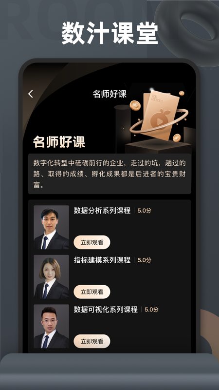 数汁课堂app是专为金融从业者打造的数字能力提升平台,致力于成为金融人的数字能力补给站。作为一站式金融数字人才培养服务平台,我们提供涵盖金融数商培养、名师精品课程以及数字化转型实战课程等全方位服务,助力金融从业者及意向从业者快速掌握数字化技能,在金融科技时代脱颖而出。