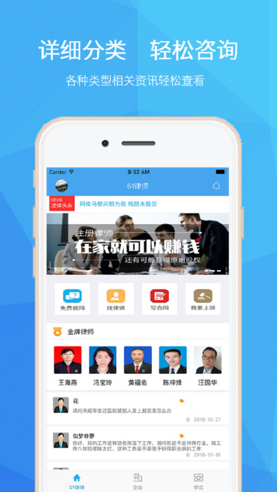 51律师致力于打造一个多方共赢的互联网法律生态圈。在这个平台上,律师可以突破地域限制,通过移动互联网拓展业务渠道,实现专业价值的最大化;用户则能以更低的成本获取更优质的法律服务。平台的核心功能包括: