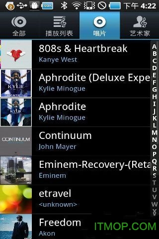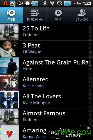 顶部的标签有艺术家,专辑,歌曲,播放列表和流派可供用户按各种习惯的方式选择曲目欣赏,界面类似,有一定的改进。新版增加了智能推荐功能,能根据用户听歌习惯自动生成个性化歌单。
