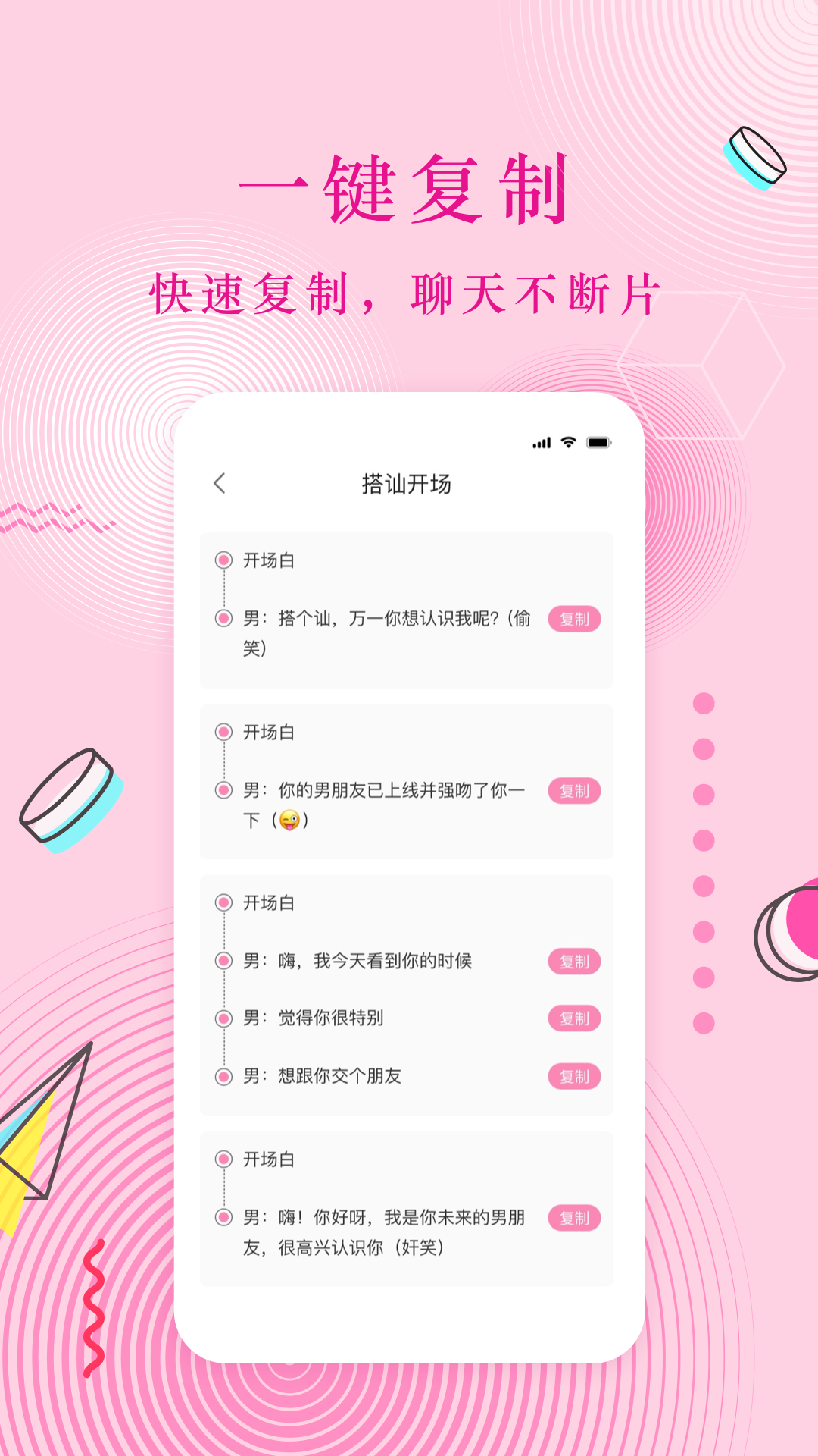 这款软件汇集了各种场景下的经典话术模板,让你不再为聊天内容发愁。无论是初次相识还是热恋阶段,都能找到合适的表达方式。你可以直接复制粘贴软件中的回复,轻松应对各种聊天场景。软件还会根据不同的恋爱进度推荐相应的话术内容,从日常问候到深情告白一应俱全,让你的每句话都能打动对方的心。