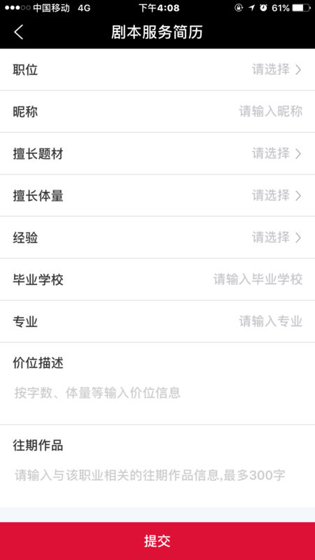 修复已知bug,优化功能。新增消息提醒设置,支持自定义通知方式;改进搜索算法,提升职位匹配精准度;增加作品集管理功能,方便编剧随时更新和整理个人作品。