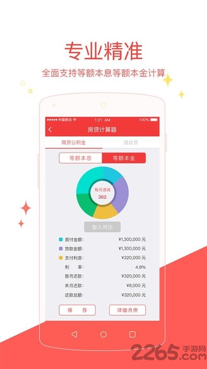 房贷计算器专业版手机版是一款功能强大、操作便捷的房贷计算工具,专为有购房贷款需求的用户量身打造。在当今社会,贷款买房已成为大多数人的选择,但复杂的贷款计算往往让人头疼。房贷计算器专业版手机版不仅能为您提供精准的房贷计算结果,还能通过直观的图表展示还款详情,让您轻松掌握贷款全貌。无论您是首次购房还是计划提前还款,都能通过这款应用获得专业的金融支持。现在就到2264安卓网下载体验吧!