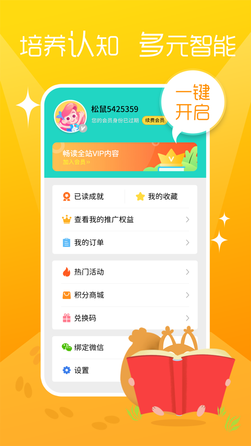 - 智能分级阅读系统根据儿童年龄、阅读能力自动匹配内容,科学划分启蒙期、成长期和进阶期三个阶段,每个阶段都配有专业的阅读能力测评工具