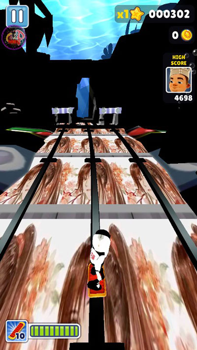 跳跃的距离也不是一成不变的。在上坡的路段,跳跃距离明显会短很多,下坡的路段,跳跃距离又会长很多。所以,在这些地方躲避障碍物的时候一定要把握好起跳的距离。(PS:地铁跑酷基本上都是在平地上或者火车上,部分路段也会有起伏)在黑暗环境中更要留意地形变化,可以借助金币的分布来判断地形。